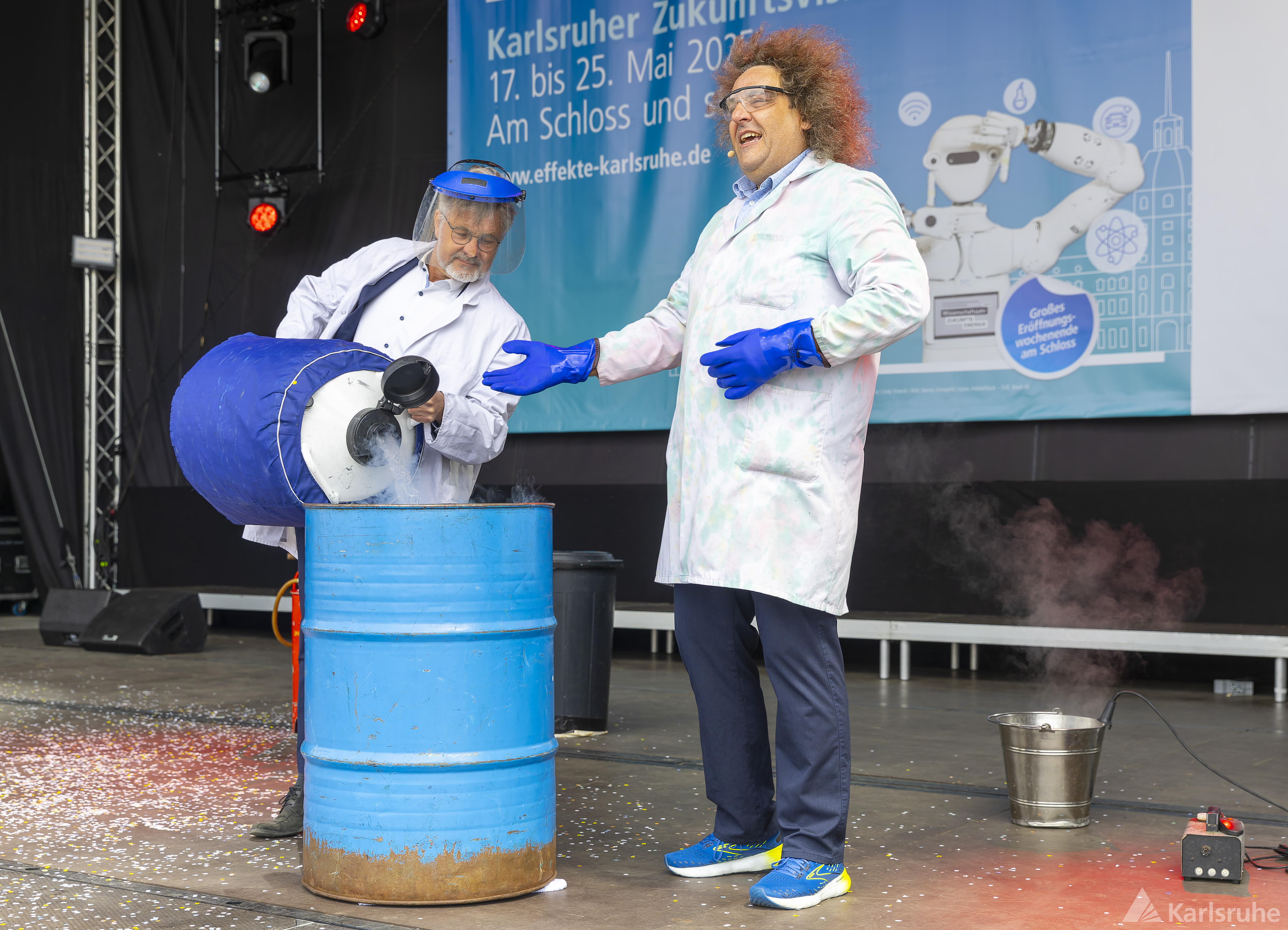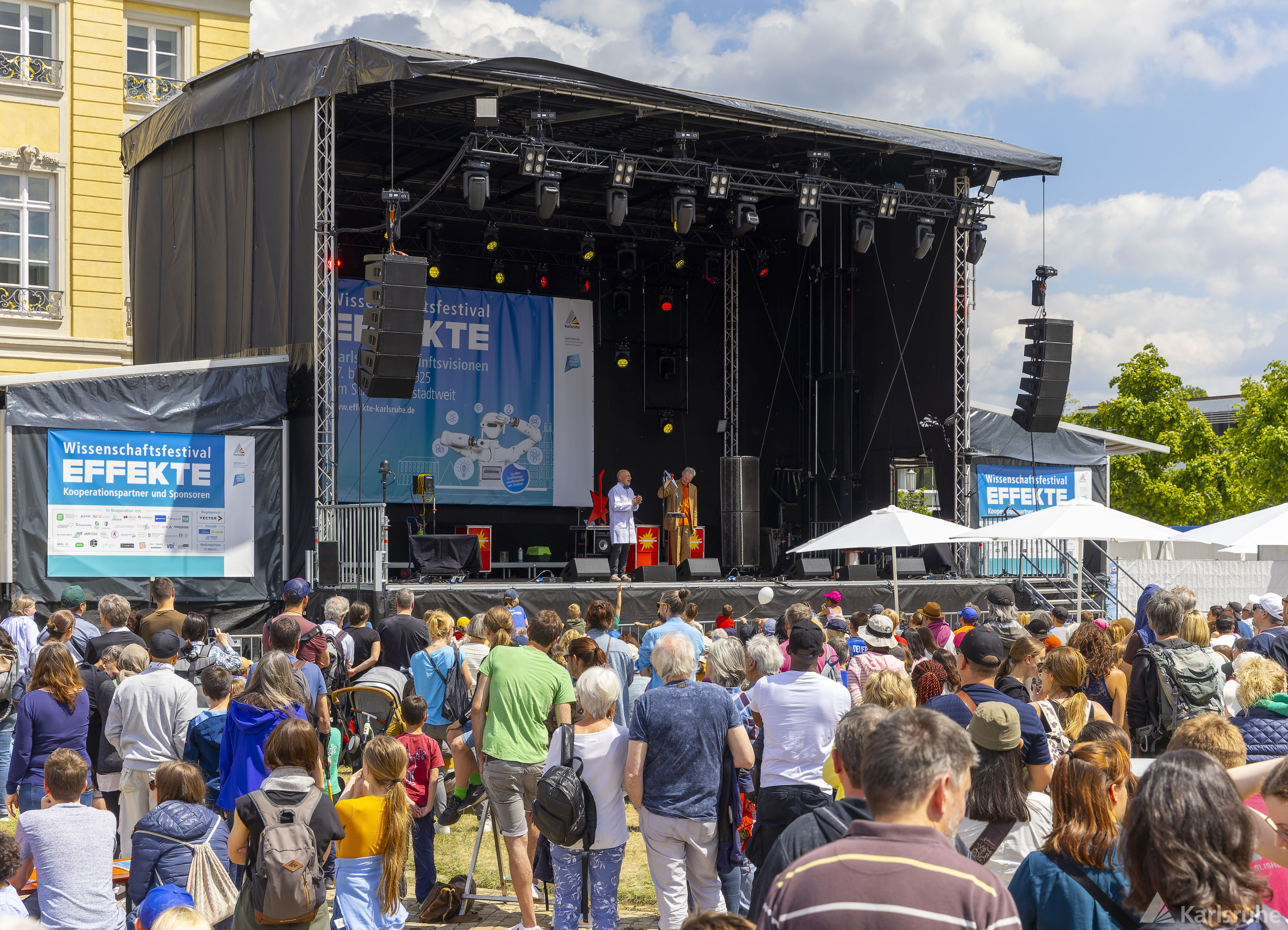 Beim Wissenschaftsfestival EFFEKTE drehte sich 2025 alles um „Karlsruher Zukunftsvisionen“. Vom 17. bis 25. Mai präsentierten Karlsruher Hochschulen, Forschungseinrichtungen und Partner ihre Ideen für morgen – in Ausstellungen, Workshops, Vorträgen, Wissenschaftsshows und vielem mehr. Ein besonderes Highlight war das Eröffnungswochenende vor dem Schloss mit einem bunten Bühnenprogramm und der großen Wissenschaftszeltstadt.